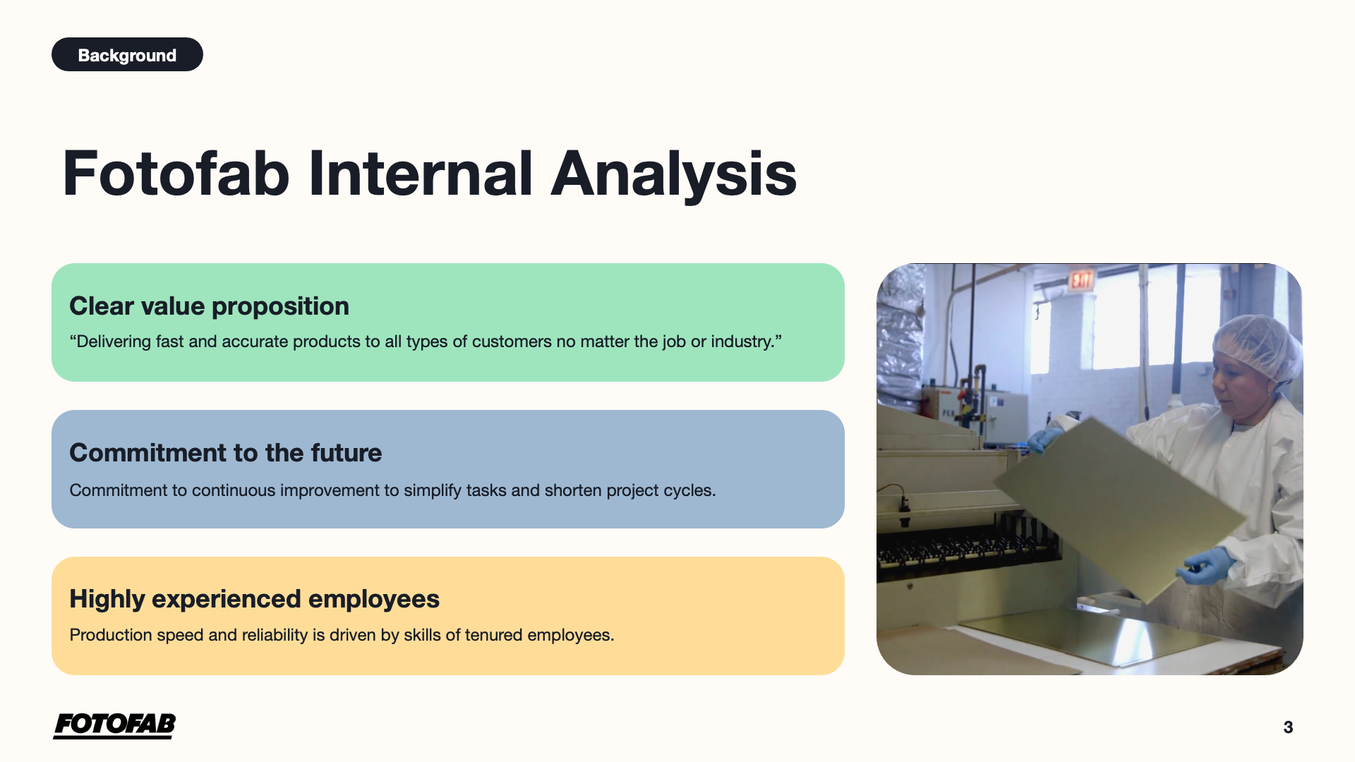 Fotofab operates in an ever-changing, complex marketplace plentiful with competitors and substitutes each offering their own proposition to customers in need of specialty metal parts. Fotofab has succeeded in developing and protecting a strong value proposition centered around delivering chemically etched metal parts with speed, precision, and reliability. This strategy enables the company to compete effectively in segments where design complexity and rapid turnaround are essential to customer retention.