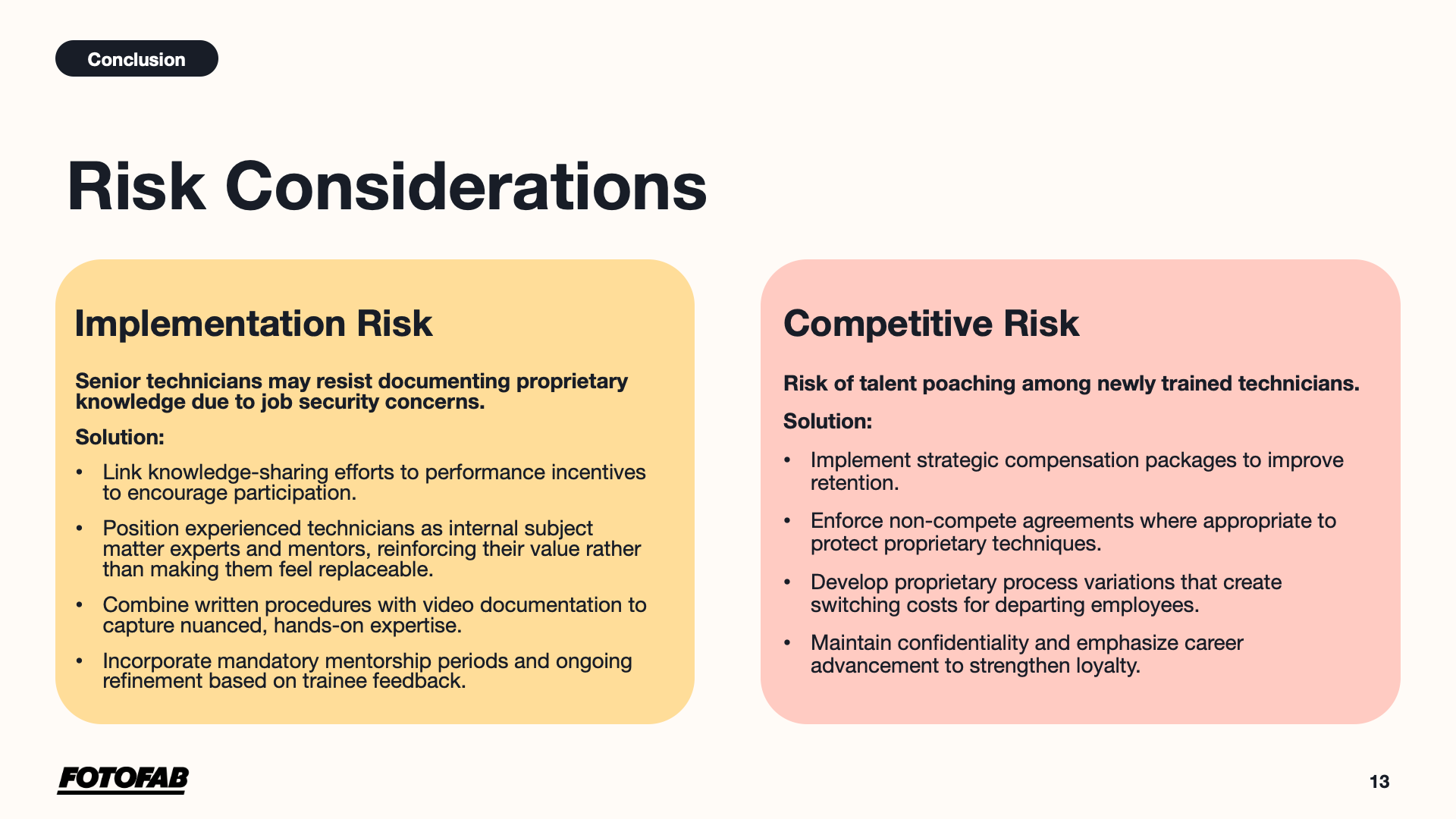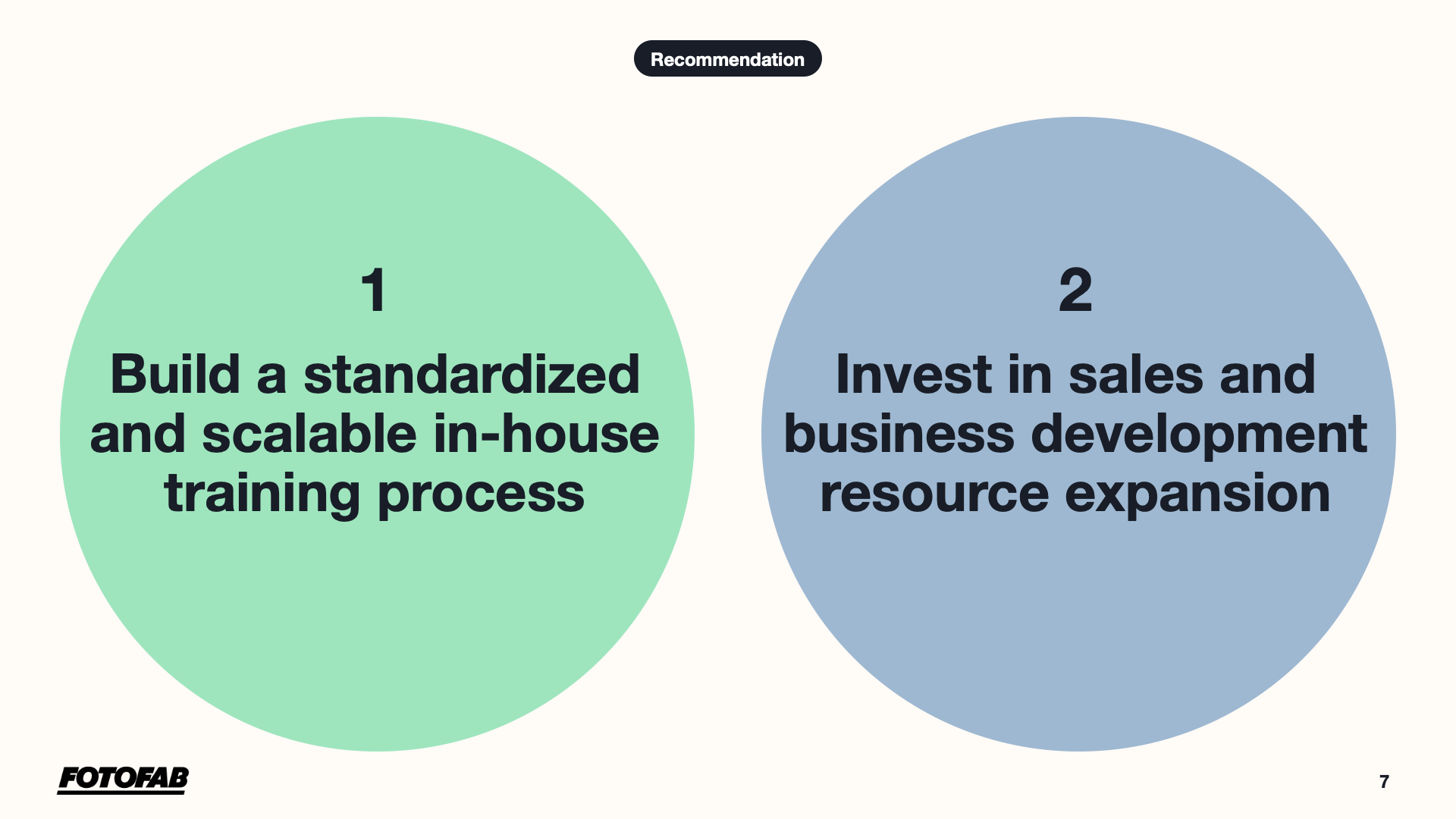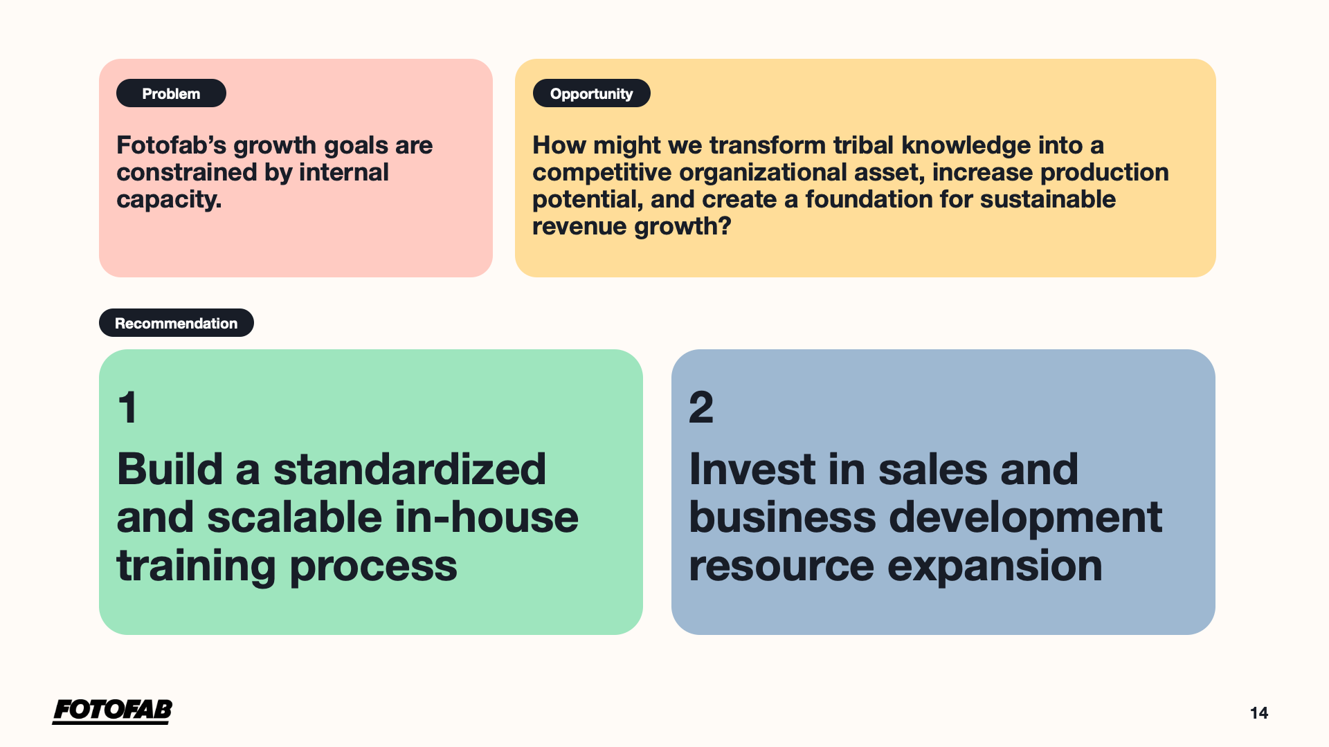 To protect its market advantage and position itself for sustainable growth, Fotofab should invest in strengthening its internal knowledge-sharing practices, building a standardized and scalable in-house training process, and expanding its sales and business development resources. These initiatives will mitigate operational and quality risks, transform process knowledge into a competitive organizational asset, increase production potential, and unlock capacity for additional customer demand. Ultimately, these improvements will bolster Fotofab’s core value proposition of “delivering fast and accurate products to all types of customers no matter the job or industry” while creating a foundation for sustained, long-term growth and "commitment to the future of the industry.”