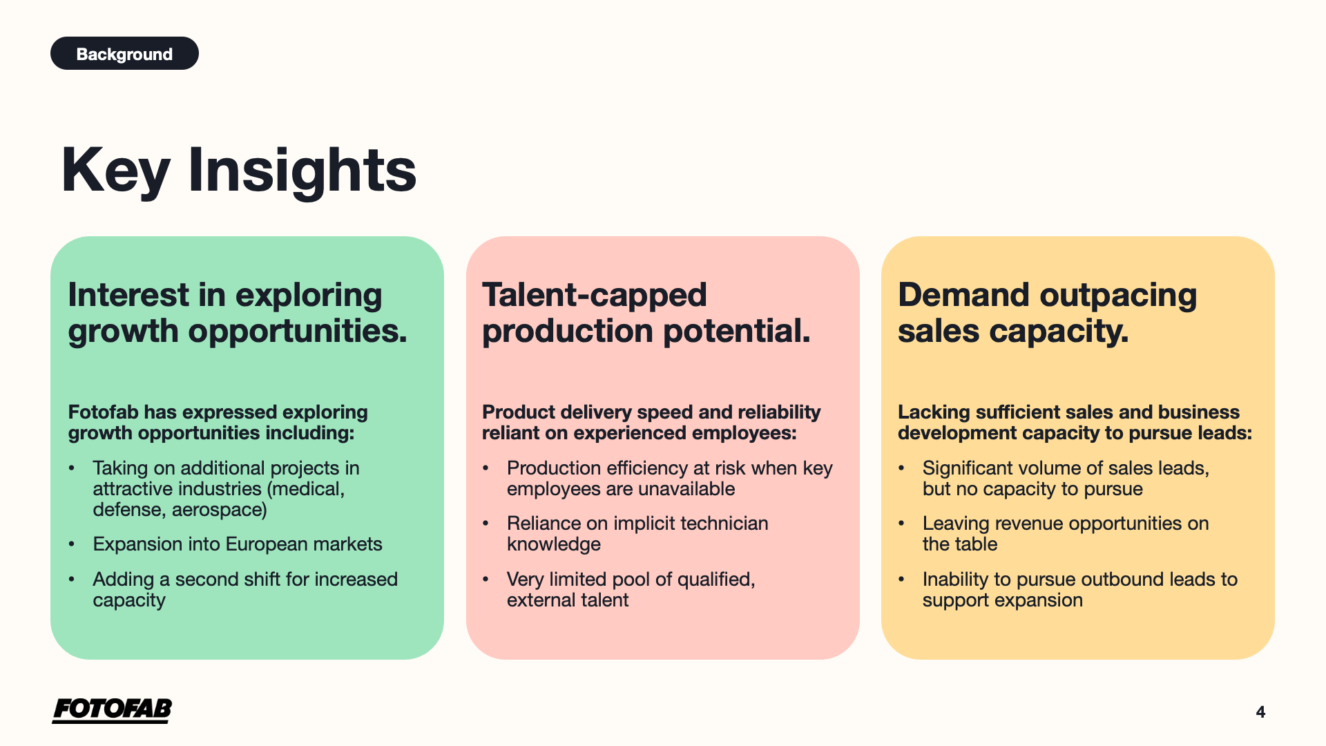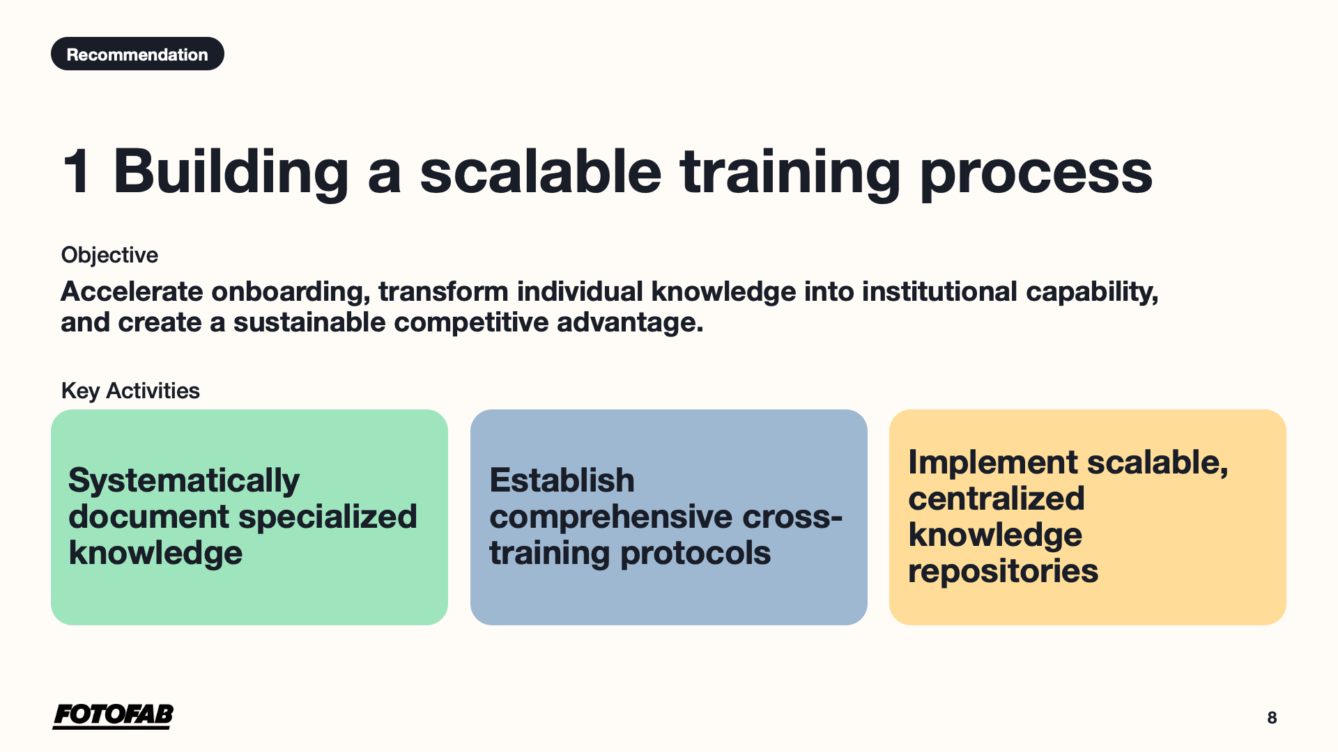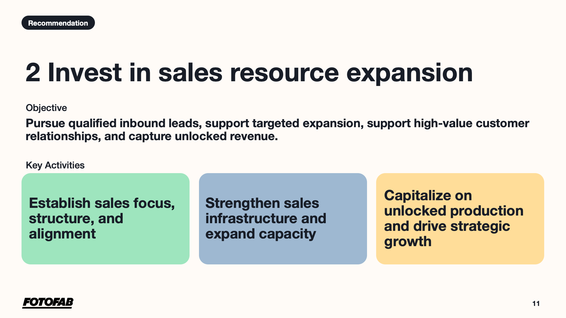 To protect its market advantage and position itself for sustainable growth, Fotofab should invest in strengthening its internal knowledge-sharing practices, building a standardized and scalable in-house training process, and expanding its sales and business development resources. These initiatives will mitigate operational and quality risks, transform process knowledge into a competitive organizational asset, increase production potential, and unlock capacity for additional customer demand. Ultimately, these improvements will bolster Fotofab’s core value proposition of “delivering fast and accurate products to all types of customers no matter the job or industry” while creating a foundation for sustained, long-term growth and "commitment to the future of the industry.”